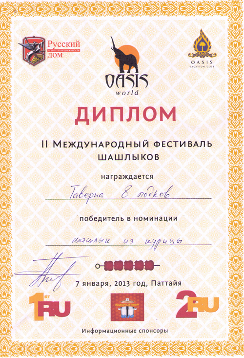 С гордостью сообщаем, что Таверна 8 Подков заняла первое место в номинации "Шашлык из курицы", награда была вручена под аплодисменты сытых и довольных зрителей, которые после конкурса наслаждались известными и новыми шлягерами.